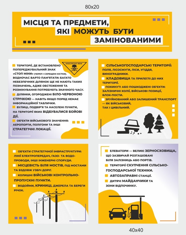 Потенційно небезпечними можуть бути як спеціально позначені території зі знаками «Обережно міни», так і зовні безпечні на перший погляд місця. До зони ризику належать території, де відбувалися бойові дії, покинуті будівлі, сільськогосподарські угіддя, лісосмуги, узбіччя доріг, водойми, інфраструктурні об’єкти, транспорт та навіть дитячі майданчики. Важливо розуміти, що відсутність попереджувальних знаків не гарантує безпеки, адже процес розмінування є тривалим і складним.