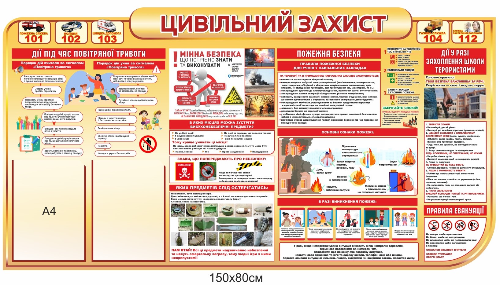 Візуальні матеріали значно підвищують ефективність засвоєння інформації. Саме тому стенд “Цивільний захист” розроблений у форматі 150×80 см, із чіткими ілюстраціями, кольоровими позначеннями та виділенням ключових дій.